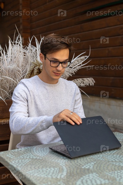 Студент работает за ноутбуком в парке