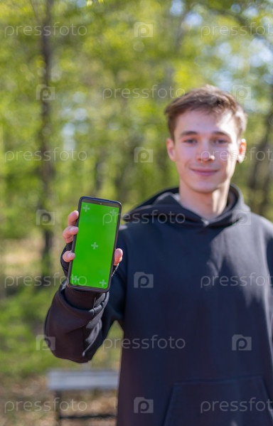 Студент работает за ноутбуком в парке. Хромакейный экран