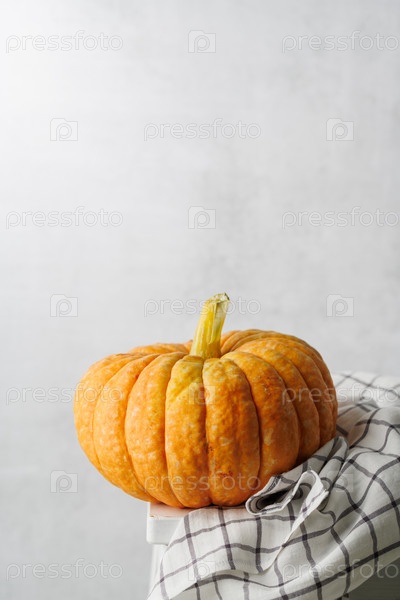 Одна спелая целая тыква на светлом фоне, украшенная текстилем. Осенний урожай. Вертикальный