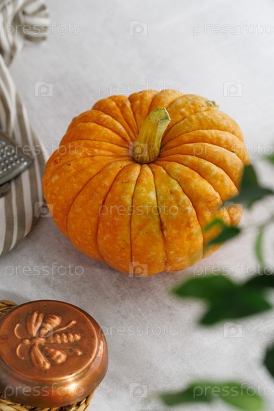 Целые тыквы на столе. Солнечный день. Украшен текстилем и кухонным оборудованием. Осенний урожай