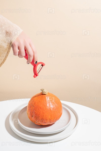 Натюрморт. Девушка тянется ножом для чистки к целой тыкве. Бежевый фон. Концепция