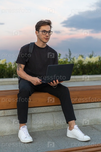 Студент работает за ноутбуком в парке