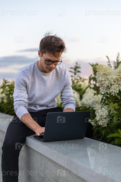 Студент работает за ноутбуком в парке