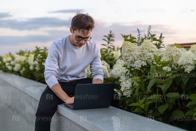 Студент работает за ноутбуком в парке