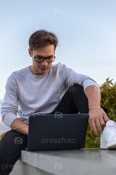 Студент работает за ноутбуком в парке