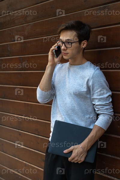 Студент работает за ноутбуком в парке