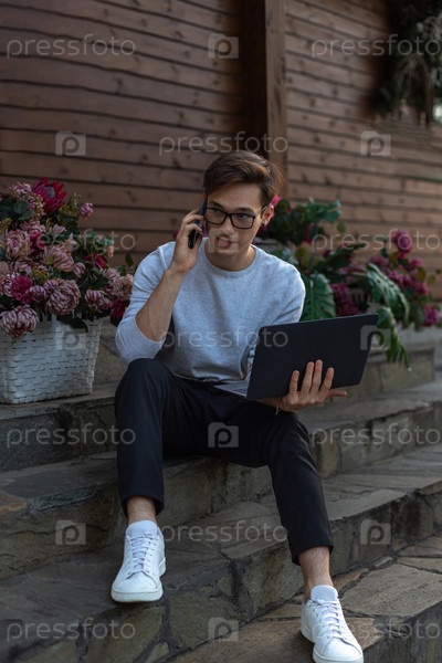 Студент работает за ноутбуком в парке