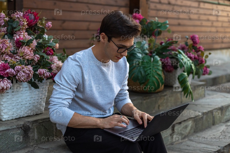 Студент работает за ноутбуком в парке