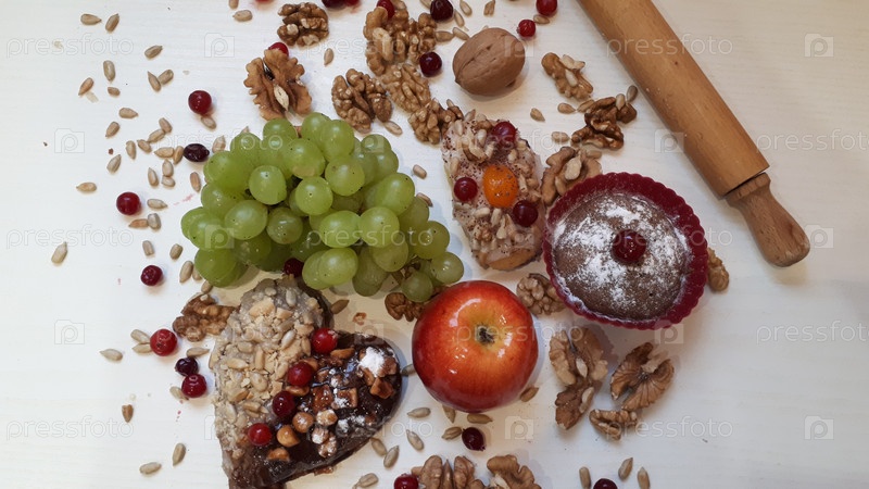 Домашнее печенье с клюквой, глазурю, с арахисом и изюмом на столе