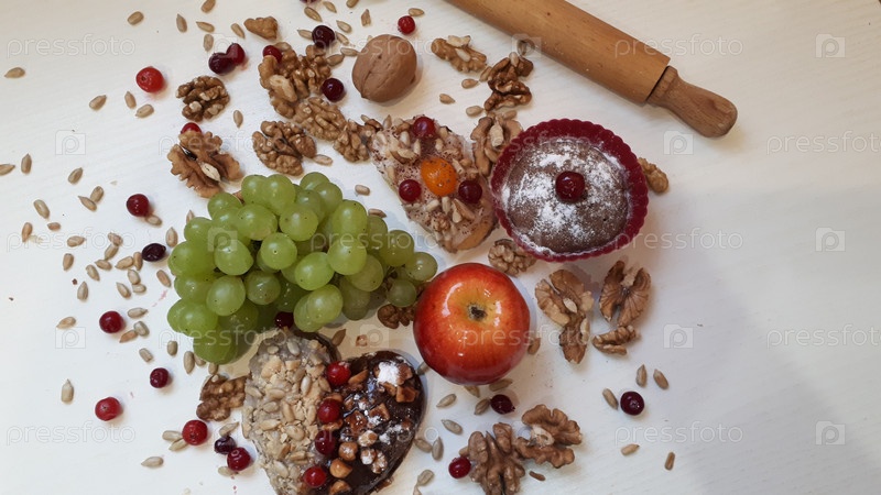 Домашнее печенье с клюквой, глазурю, с арахисом и изюмом на столе