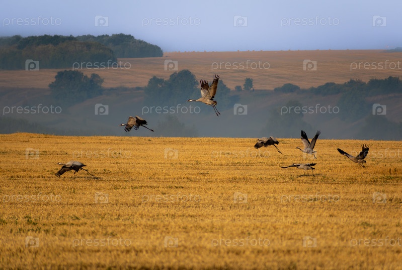 Журввли взлетают с убранного поля туманным утром