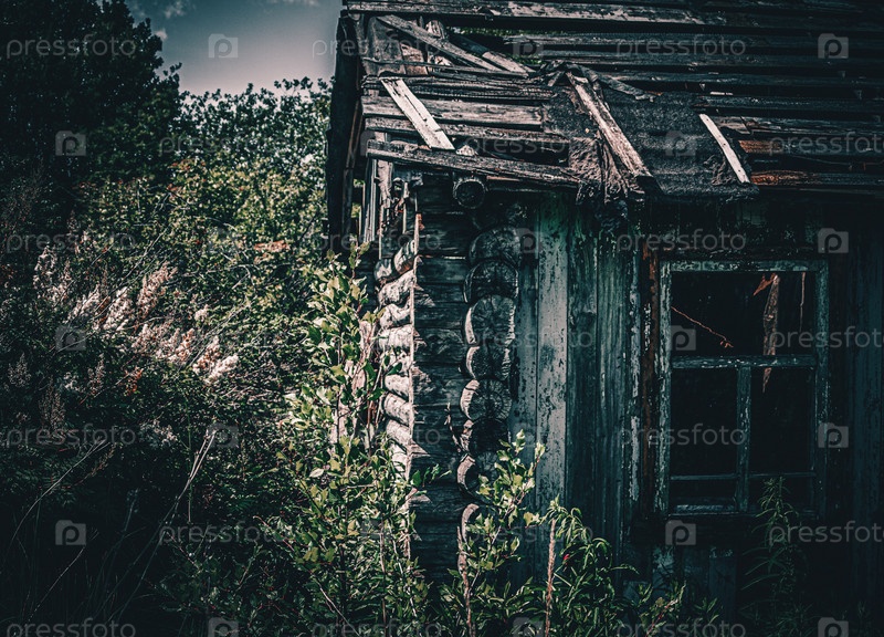 Заброшенные сады в окресностях города Чистополь. Разрушенные бревенчатые стены и буйная растительность вокруг, июнь полдень