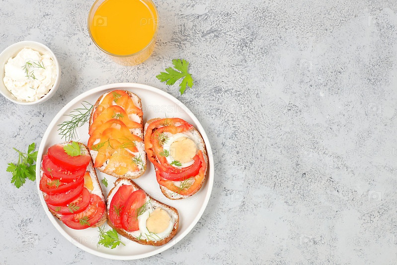 Здоровый завтрак с ингредиентами. Диетические веганские мини-сэндвичи с мягким творогом и свежими овощами, огурцами, помидорами, сладким перцем, яйцом и специями, концепция здорового и натурального питания, образ жизни, плоская планировка, место для текст