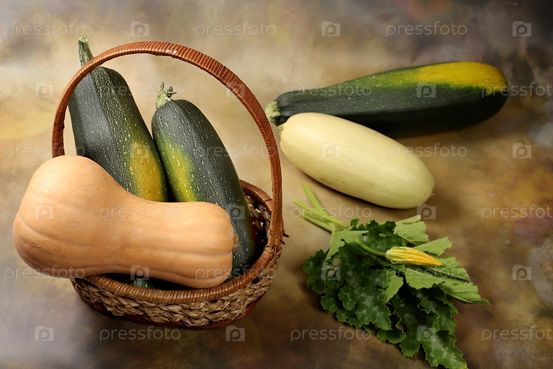 Различные сорта кабачков в корзине на старом фоне, концепция осеннего урожая, полосатые, белые и золотые кабачки для выращивания в сельском хозяйстве, органические полезные продукты, селективный фокус