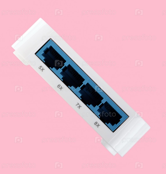 Белый 8-портный пластиковый коммутатор Ethernet изолирован на розовом фоне в сухой день