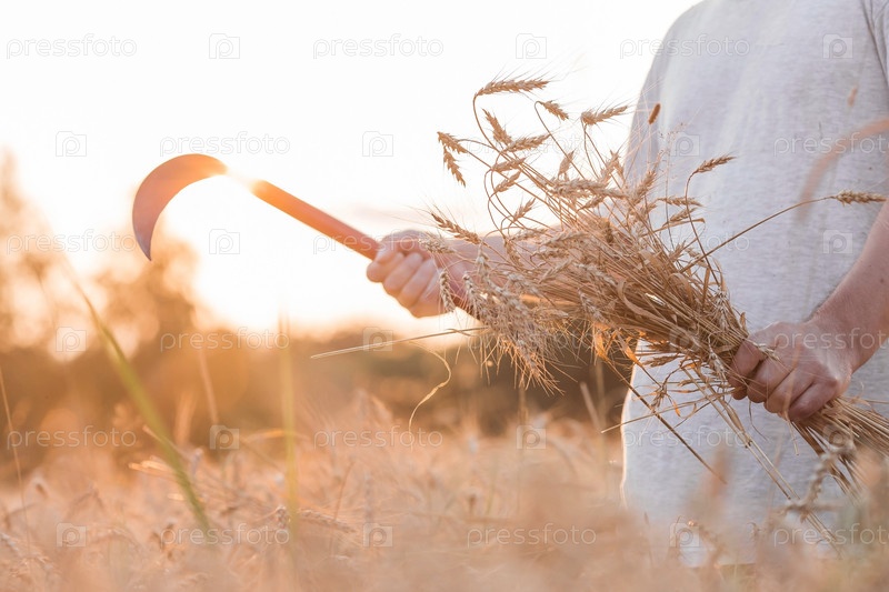 Мужчина держит золотые колосья пшеницы и серп на фоне созревающего поля. Руки фермера крупным планом. Концепция посадки и сбора богатого урожая. Сельский пейзаж на закате
