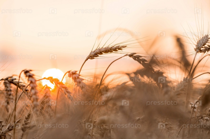 Золотые колосья пшеницы на фоне созревающего поля. Сельскохозяйственный завод крупным планом. Концепция посадки и сбора богатого урожая. Сельский пейзаж на закате