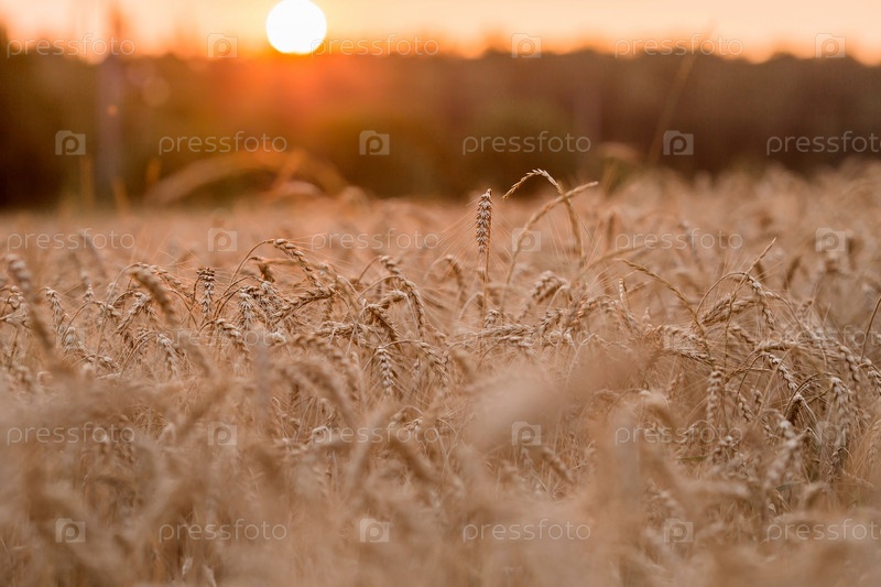 Золотые колосья пшеницы на фоне созревающего поля. Сельскохозяйственный завод крупным планом. Концепция посадки и сбора богатого урожая. Сельский пейзаж на закате