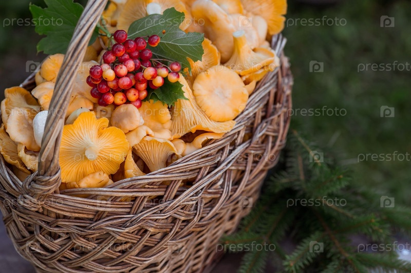 Благородные, съедобные грибы лисички. Красивая плетеная корзина с грибами и резиновые сапоги на даче. Деревенский натюрморт. Сбор грибов