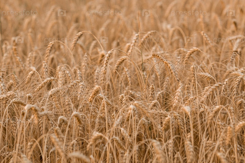 Золотые колосья пшеницы на фоне созревающего поля. Сельскохозяйственный завод крупным планом. Концепция посадки и сбора богатого урожая. Сельский пейзаж на закате