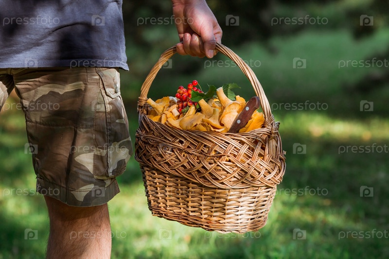 Благородные, съедобные грибы лисички. Грибник собирает лисички в березовом лесу. Красивая плетеная корзина с грибами в руках мужчины