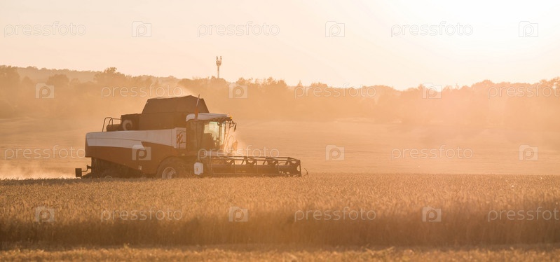 Сельскохозяйственная техника. Сельскохозяйственная промышленность. Комбайн удаляет золотые колосья спелой пшеницы на фоне созревающего поля. Концепция посадки и сбора богатого урожая. Сельский пейзаж на закате
