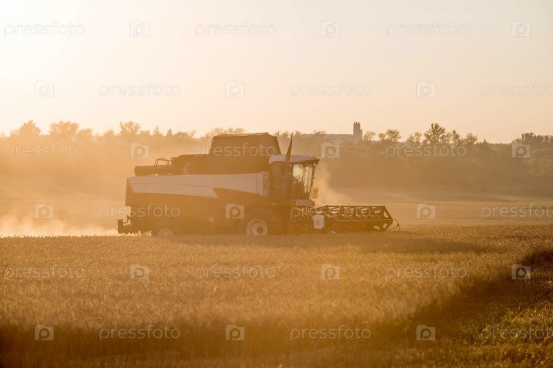 Сельскохозяйственная техника. Сельскохозяйственная промышленность. Комбайн удаляет золотые колосья спелой пшеницы на фоне созревающего поля. Концепция посадки и сбора богатого урожая. Сельский пейзаж на закате