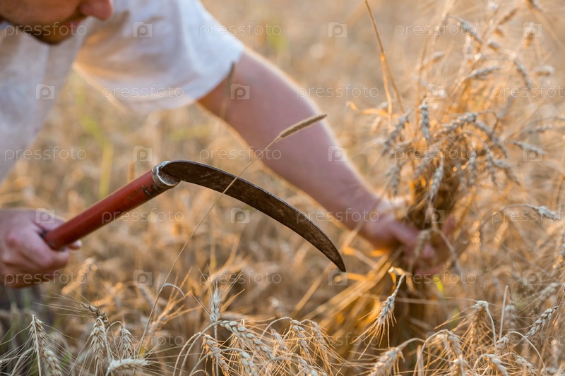 Мужчина держит золотые колосья пшеницы и серп на фоне созревающего поля. Руки фермера крупным планом. Концепция посадки и сбора богатого урожая. Сельский пейзаж на закате
