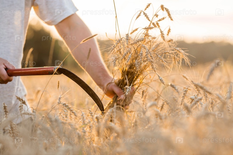Мужчина держит золотые колосья пшеницы и серп на фоне созревающего поля. Руки фермера крупным планом. Концепция посадки и сбора богатого урожая. Сельский пейзаж на закате