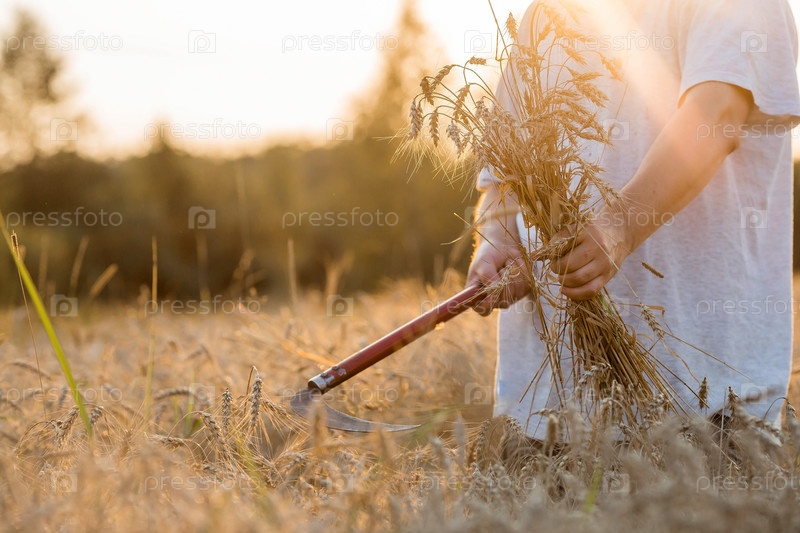 Мужчина держит золотые колосья пшеницы и серп на фоне созревающего поля. Руки фермера крупным планом. Концепция посадки и сбора богатого урожая. Сельский пейзаж на закате
