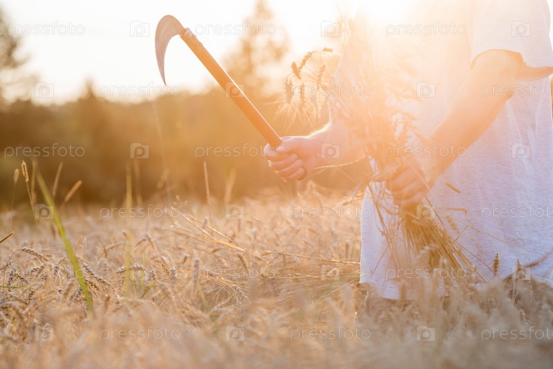 Мужчина держит золотые колосья пшеницы и серп на фоне созревающего поля. Руки фермера крупным планом. Концепция посадки и сбора богатого урожая. Сельский пейзаж на закате