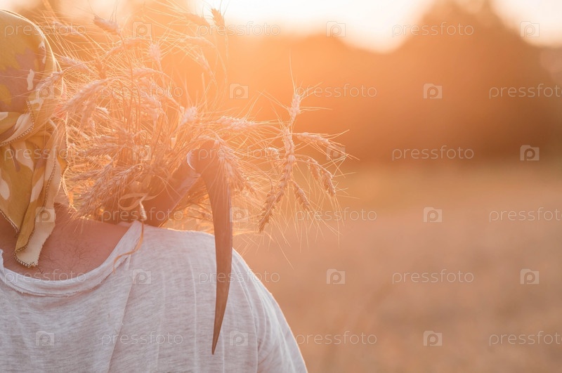 Мужчина держит золотые колосья пшеницы и серп на фоне созревающего поля. Руки фермера крупным планом. Концепция посадки и сбора богатого урожая. Сельский пейзаж на закате