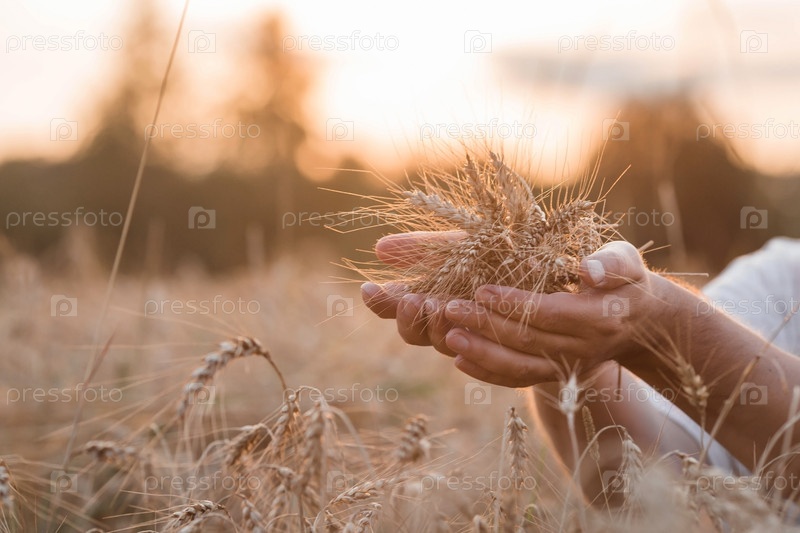 Мужчина держит золотые колосья пшеницы на фоне созревающего поля. Руки фермера крупным планом. Концепция посадки и сбора богатого урожая. Сельский пейзаж на закате