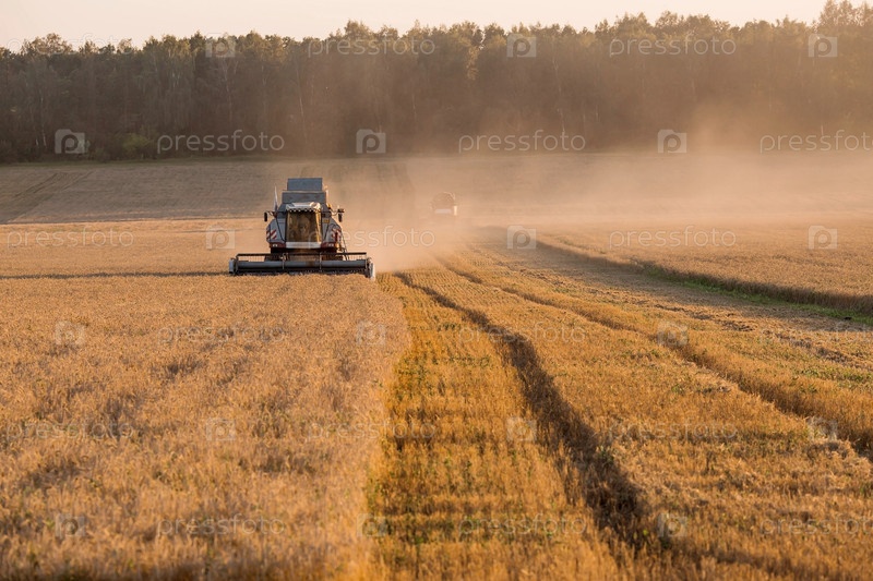Сельскохозяйственная техника. Сельскохозяйственная промышленность. Комбайн удаляет золотые колосья спелой пшеницы на фоне созревающего поля. Концепция посадки и сбора богатого урожая. Сельский пейзаж на закате