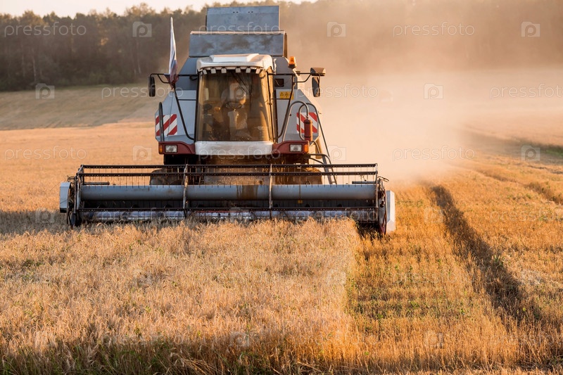 Сельскохозяйственная техника. Сельскохозяйственная промышленность. Комбайн удаляет золотые колосья спелой пшеницы на фоне созревающего поля. Концепция посадки и сбора богатого урожая. Сельский пейзаж на закате
