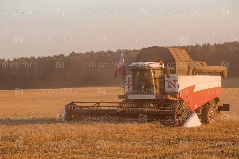 Сельскохозяйственная техника. Сельскохозяйственная промышленность. Комбайн удаляет золотые колосья спелой пшеницы на фоне созревающего поля. Концепция посадки и сбора богатого урожая. Сельский пейзаж на закате