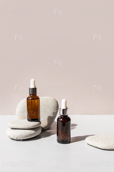 Натуральный органический продукт в двух стеклянных бутылках с капельницей на фоне серых морских камней. Пустой макет, упаковка