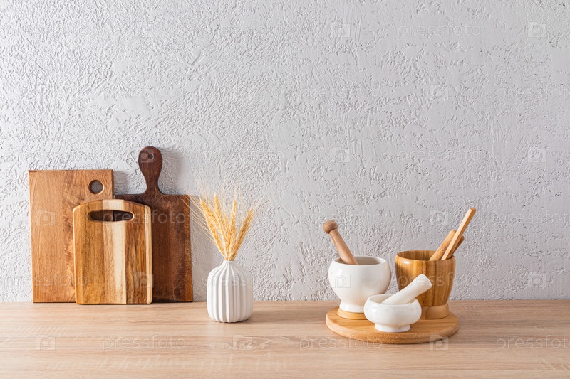 Экологически чистая кухонная утварь и посуда в интерьере кухни на деревянной столешнице. передний план. Эко стиль. бетонная стена