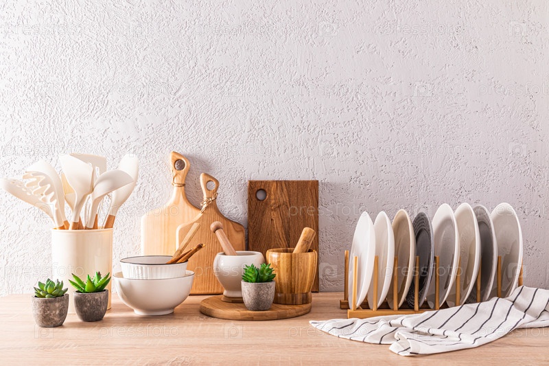 Красивый интерьер кухонной столешницы с различной кухонной утварью и декором в светлых тонах. экологически чистая кухня. Эко товары