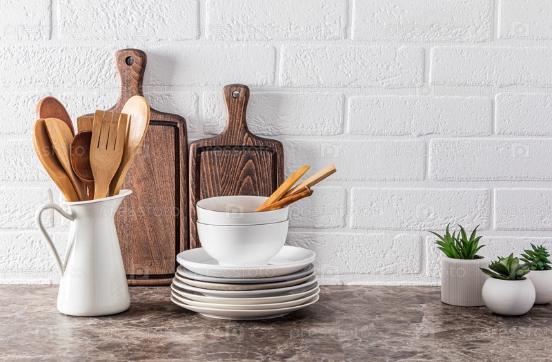 Стильный кухонный фон с набором белой посуды и деревянной кухонной утвари на мраморной темной столешнице на фоне стены из белого кирпича