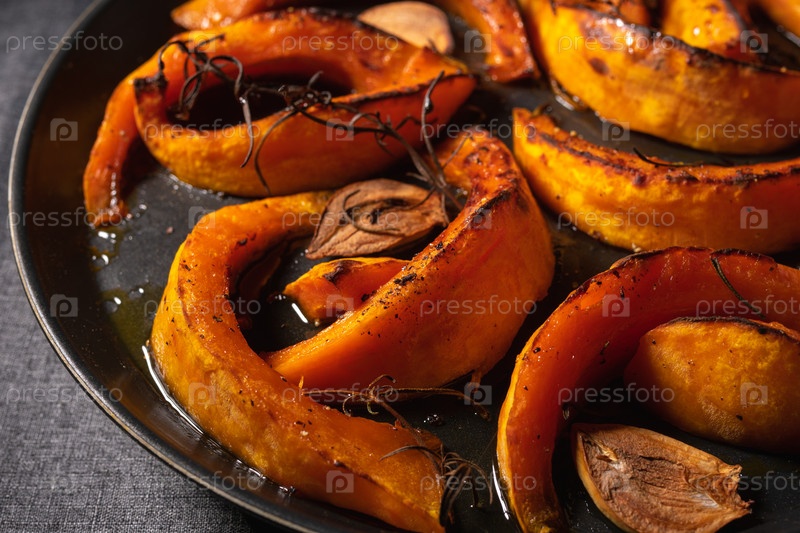 Кусочки запеченной тыквы со специями и чесноком на черной тарелке
