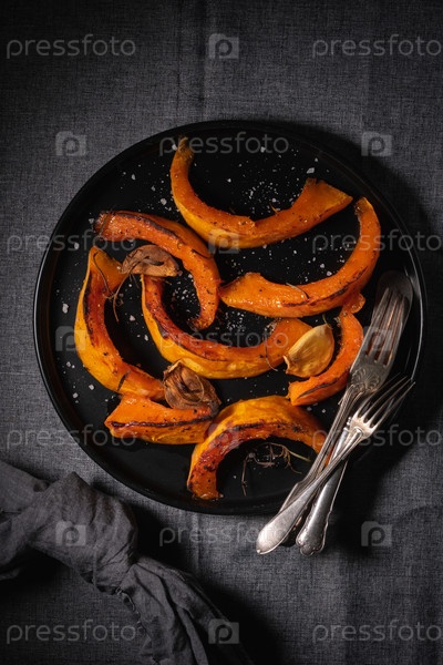 Кусочки запеченной тыквы со специями и чесноком на черной тарелке. Вид сверху