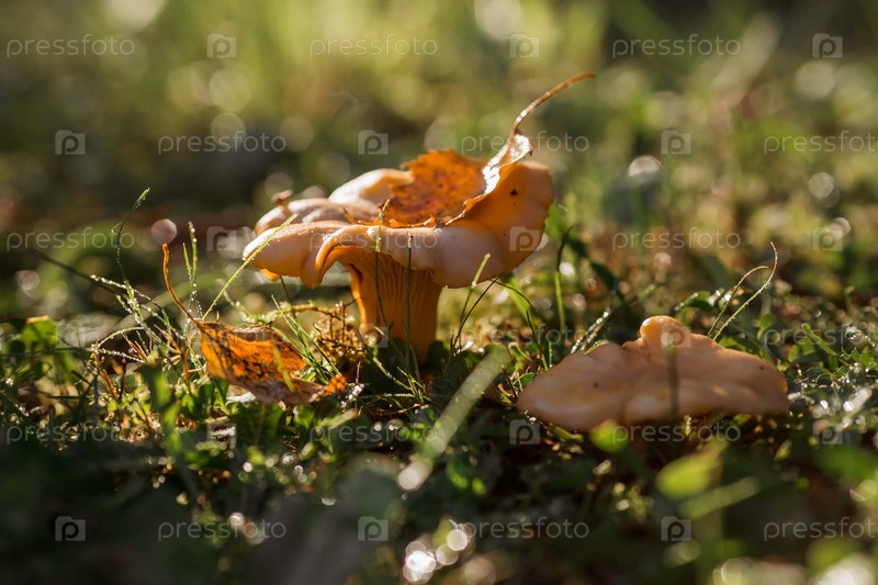 Благородные, съедобные грибы лисички. В траве березового леса растут две желтые лисички. Красивая текстура фона природы на рассвете
