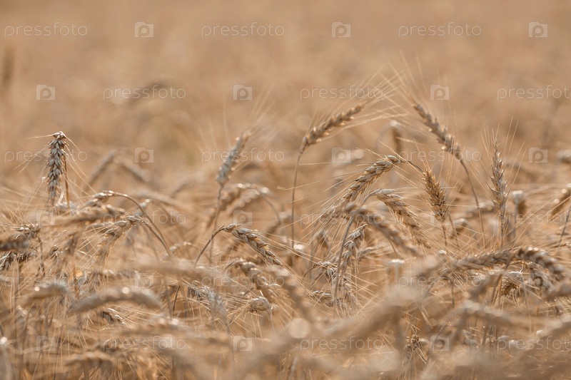 Золотые колосья пшеницы на фоне созревающего поля. Сельскохозяйственный завод крупным планом. Концепция посадки и сбора богатого урожая. Сельский пейзаж на закате