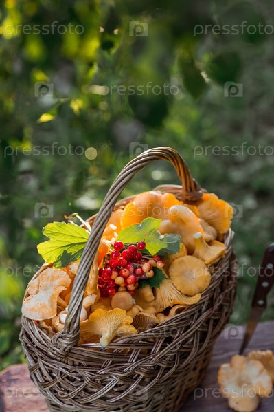Благородные, съедобные грибы лисички. Желтые лисички в красивой плетеной корзине на скамейке в березовом лесу. Красивая текстура природного фона