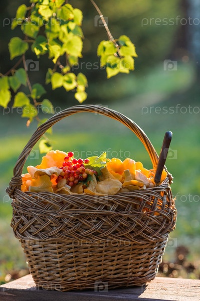 Благородные, съедобные грибы лисички. Желтые лисички в красивой плетеной корзине на скамейке в березовом лесу. Красивая текстура природного фона