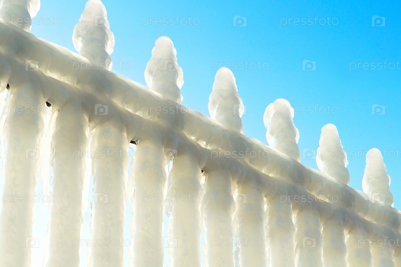 Металлический забор покрыт льдом, зима на Балтийском море, обледенение на набережной, пирс во льду