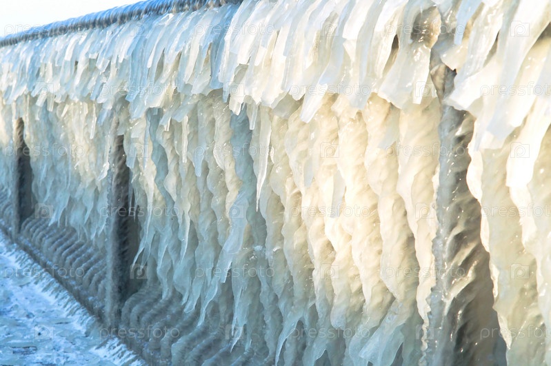 Металлический забор покрыт льдом, зима на Балтийском море, обледенение на набережной, пирс во льду