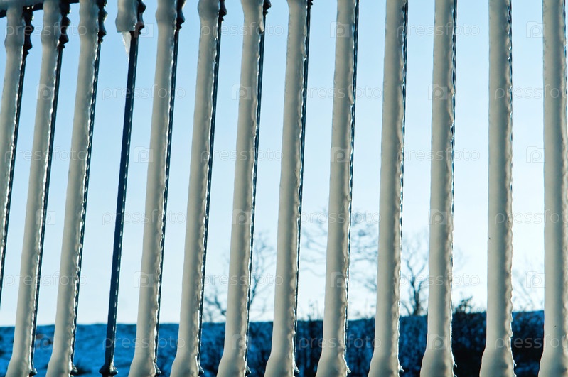 Металлический забор покрыт льдом, зима на Балтийском море, обледенение на набережной, пирс во льду