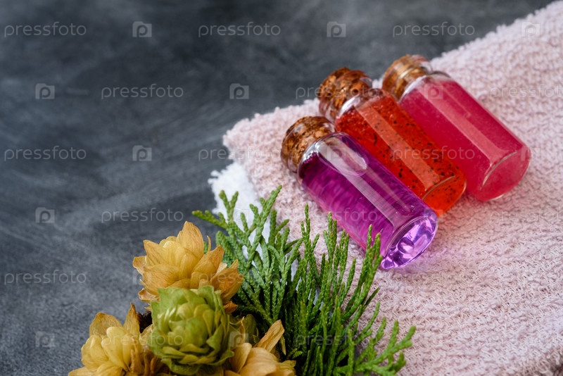 Гель для душа в стеклянных бутылках и соль для ванн на темном фоне. Спа-продукты и уход за телом